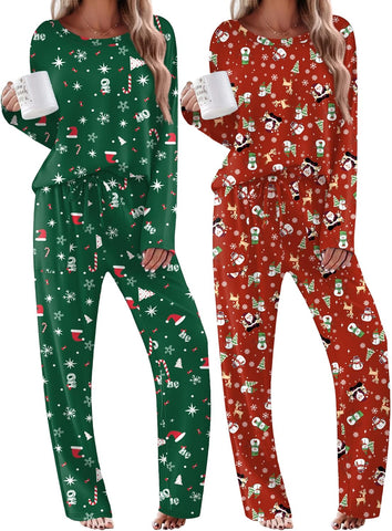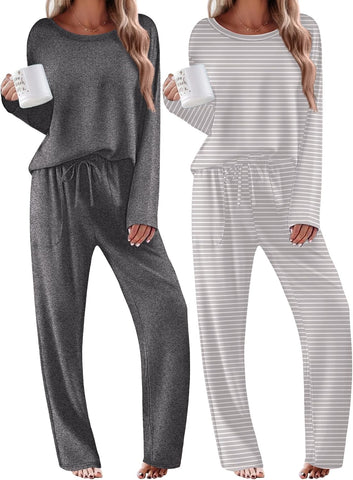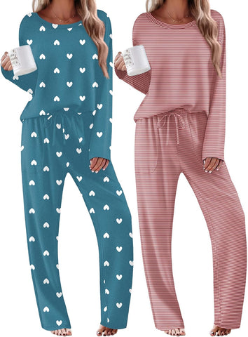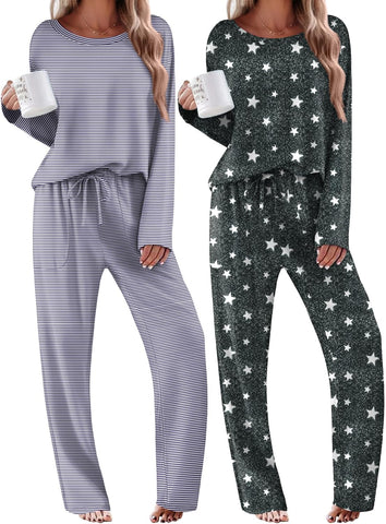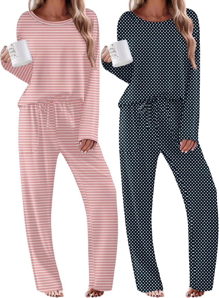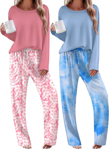 Fabric type: 95% Polyester, 5% Spandex. Care instructions: Machine Wash. Origin: Imported. Product Facts: Premium Material: Pajamas for women set is made of 95% Polyester + 5% Spandex fabric. Ultra-soft knit sleepwear, skin-friendly and comfortable to wear for PJs night set/all day. Available in a variety of convenient 2 pack sets fit for your style. Pajama Top: This women's pajamas with long sleeve pajama shirt, round neck design, and features solid color and fun print (striped, polka dots, leopard, floral, stars, tie dye, plaid and Christmas print). Lightweight and Loose sleepwear. Great for sleeping, casual wear or lounging around the house or yard all day. Pajama Bottoms: Matching cute PJs tops, long pajama pants with soft elastic waist and adjustable drawstring ensure a flattering fit, and two side pockets for convenience. With loose roomy design, great for maternity too. Various Occasions: A must-have women’s pajama set. The loungewear set ensures all-day comfort for sleeping, lounging, casual outings or work from home pajamas. Perfect for fall, winter or spring, ideal for sleepwear, night wear or pajama parties, yoga, girls’ nights, dorm rooms, fun family pictures, or as chic loungewear for coffee runs, travel, or lazy weekends. About Size & Ideal Gift Set - Our sizes are standard US sizes, please refer to the size chart carefully before ordering. This pajama pants set with high quality is great for as a birthday, Valentine's Day, Anniversary, Christmas, New Year, Wedding and any other holiday gift for your lover, mom, wife, daughter, friends.