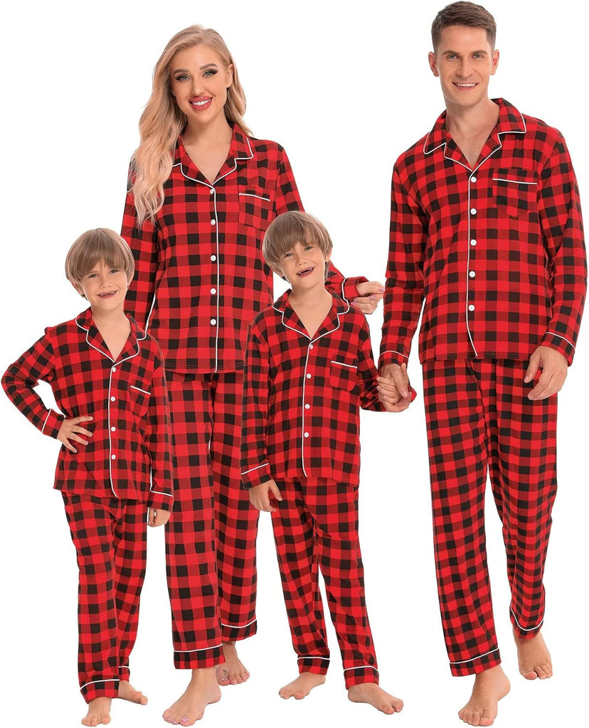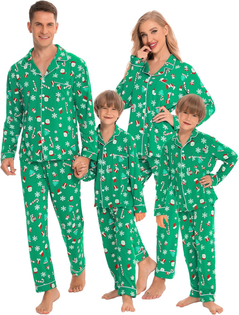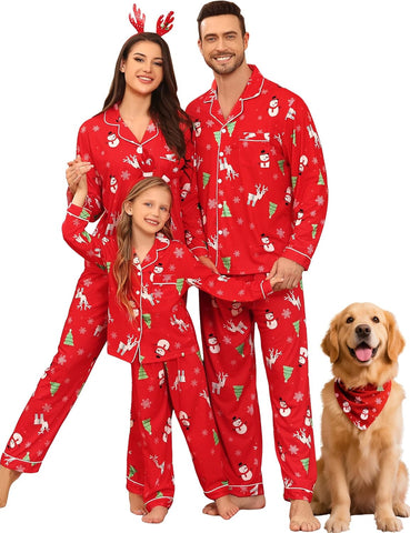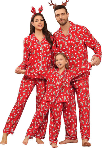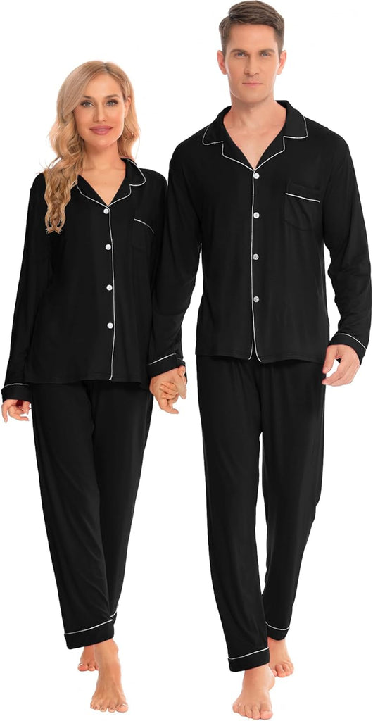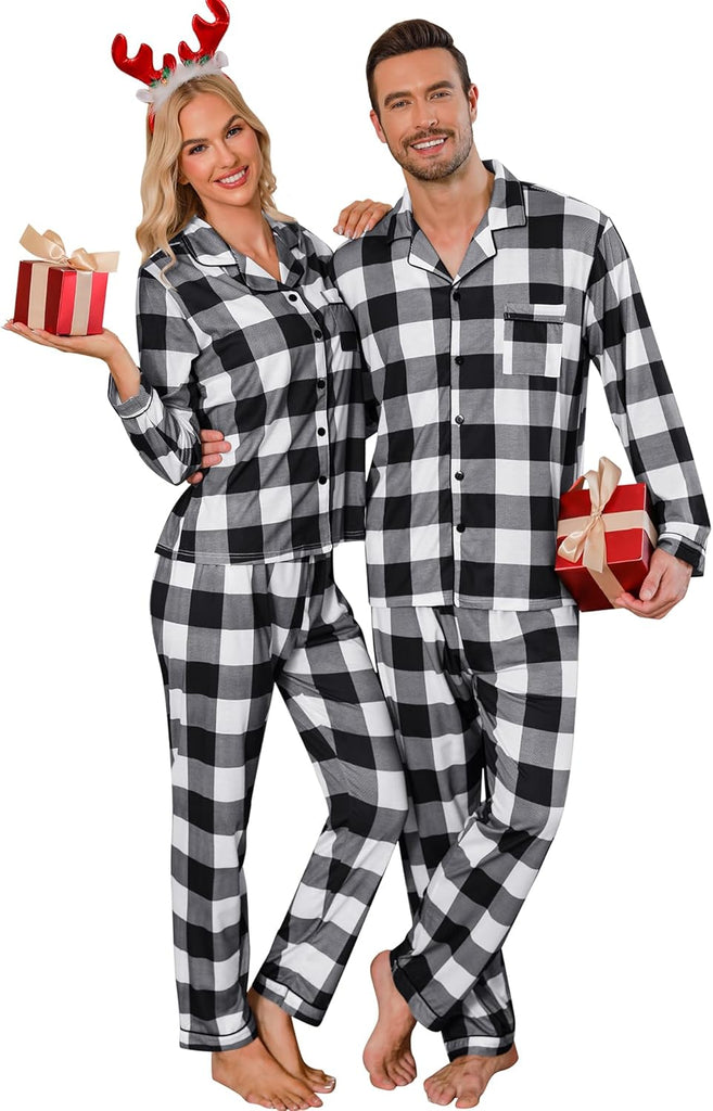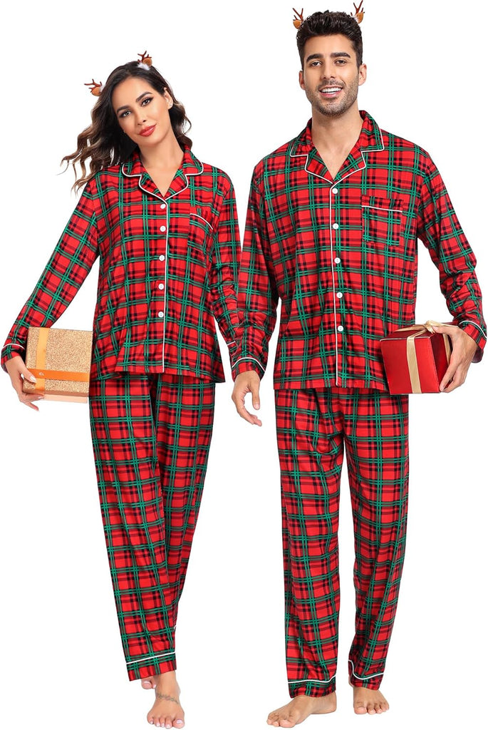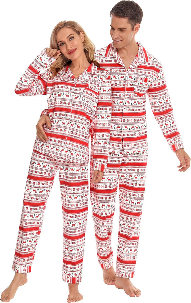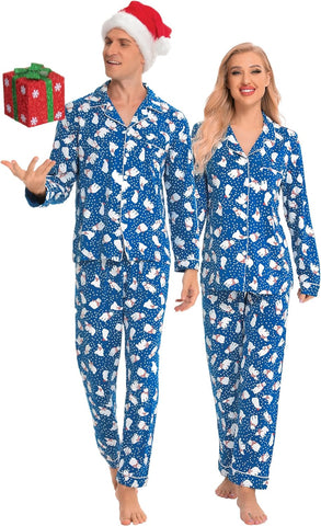 - BUTTON-DOWN PAJAMAS SETS: Classic matching Couples Xmas PJs consist of the convenient button-down long-sleeve top with a notched collar & chest pocket lending sophisticated detail; full-length pants fit perfectly with an elastic waist, keeping you comfy without being too tight.