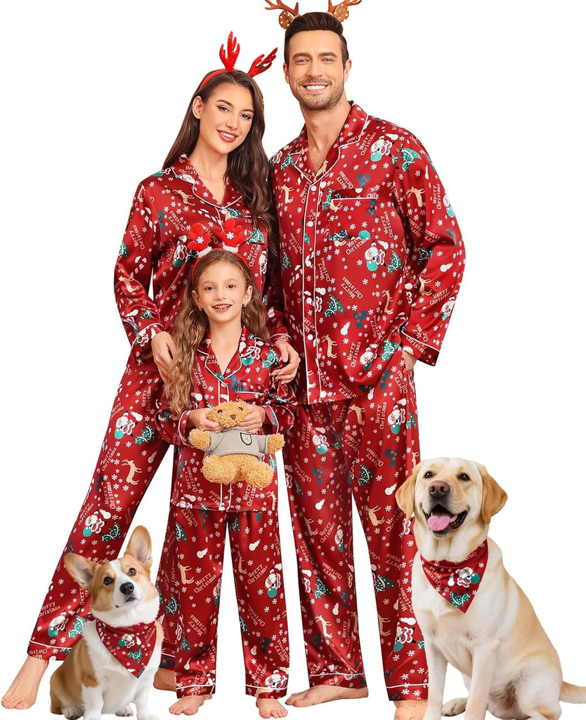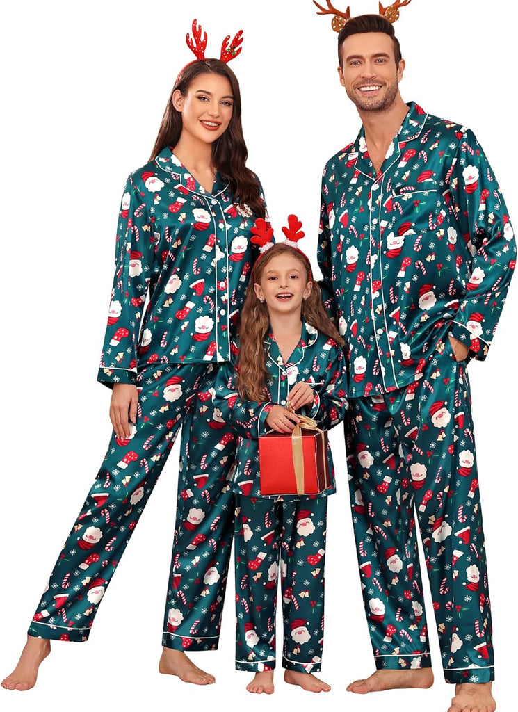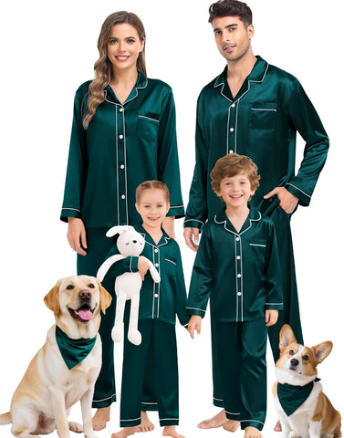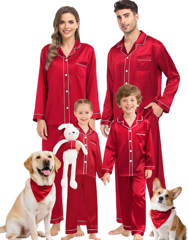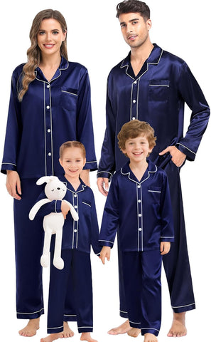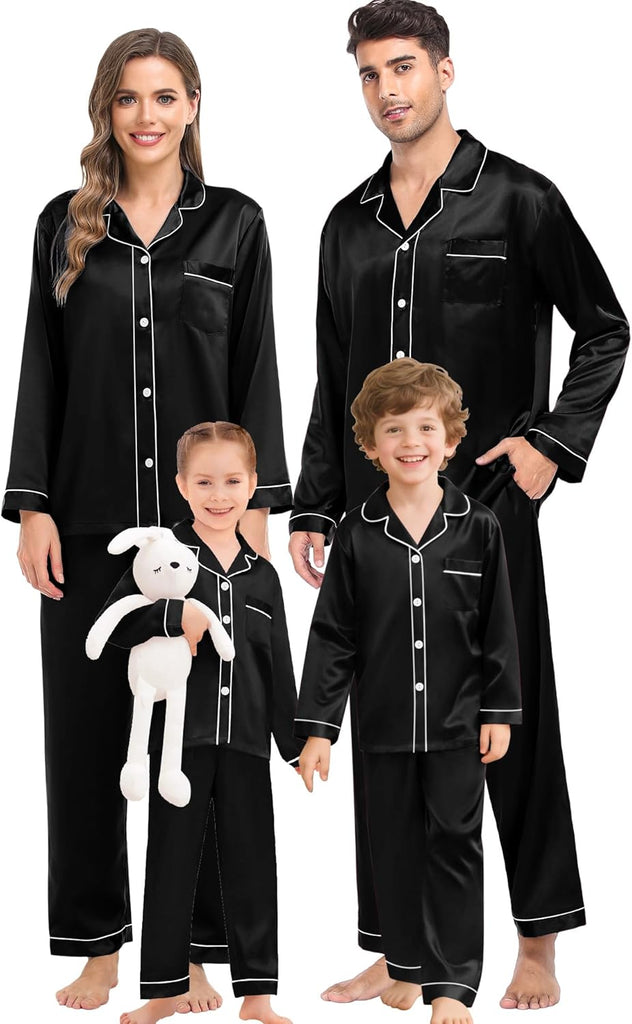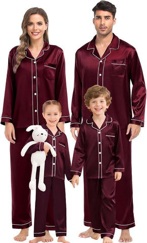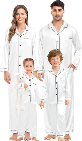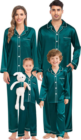 Fabric type: Silky Satin: 95% Polyester, 5% Spandex (TIPS: Each Set of These Matching PJs is Sold Separately, Please Look Out for "Men" "Women" "Kids"). Care instructions: Hand Wash or Machine Wash. Origin: Made in the USA or Imported. Product Facts: 【Premium Material】- These cozy family pajamas are made of high-quality satin (95% Polyester, 5% Spandex), which is extra-soft and comfortably comfy. These matching silk satin pajamas make cozy lounging a shared experience. Bring them out during family game night, get matching sets as a couple to make your time together extra fun. Tips: Each set of these family pajama set is sold separately. You can purchase the men's or women's or kids pajamas individually. 【The Whole Family】- The family satin pjs set are available in sizes for women, men, girls, boys and kids. Make this super-soft sleepwear part of your family’s party traditions. The whole family silk sleepwear features a notch collar, long sleeves, button-up shirt with front chest pockets, and pajama pants with an elastic waistband, which is sure to give you and your loved ones that warm and funny feeling. 【Family Gifts】- Casual Silky Pj Sets for Family are stylish, comfortable and daily, funzy with elements add family joy, making them the perfect piece of loungewear for everyone in the family! A great gift for our family! Also give a matching set to your friends family or an individual set to your husband, son or daughter! Makes for great family photos! 【Great Value】- We want you and your family to love our Holiday Family Matching Pajamas. Find matching items for all the family. All of the silk satin pajamas set is sustainably sourced and always will be. SWOMOG Family Pajamas Collection: easy-to-wear wardrobe staples that combine classic and contemporary styles. 【Kindly Tips】- Multi-funny colors and parents-child size for your choice, you can always find the most suitable one. Please check the size chart information in the left image or under the product description before ordering.