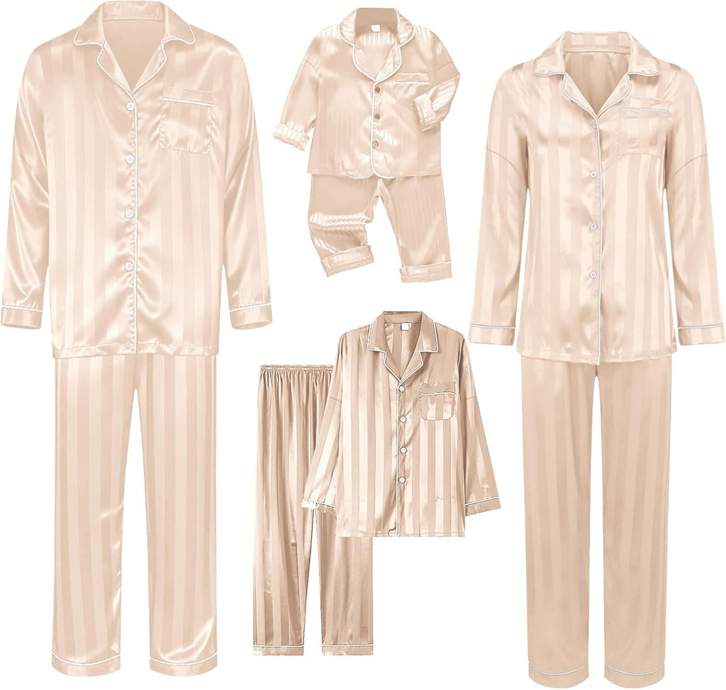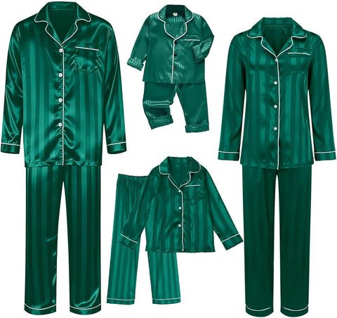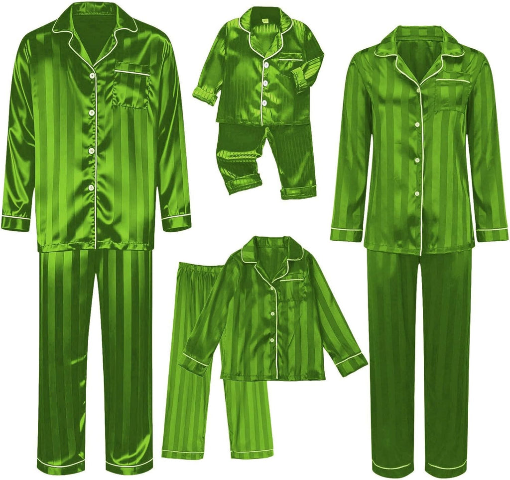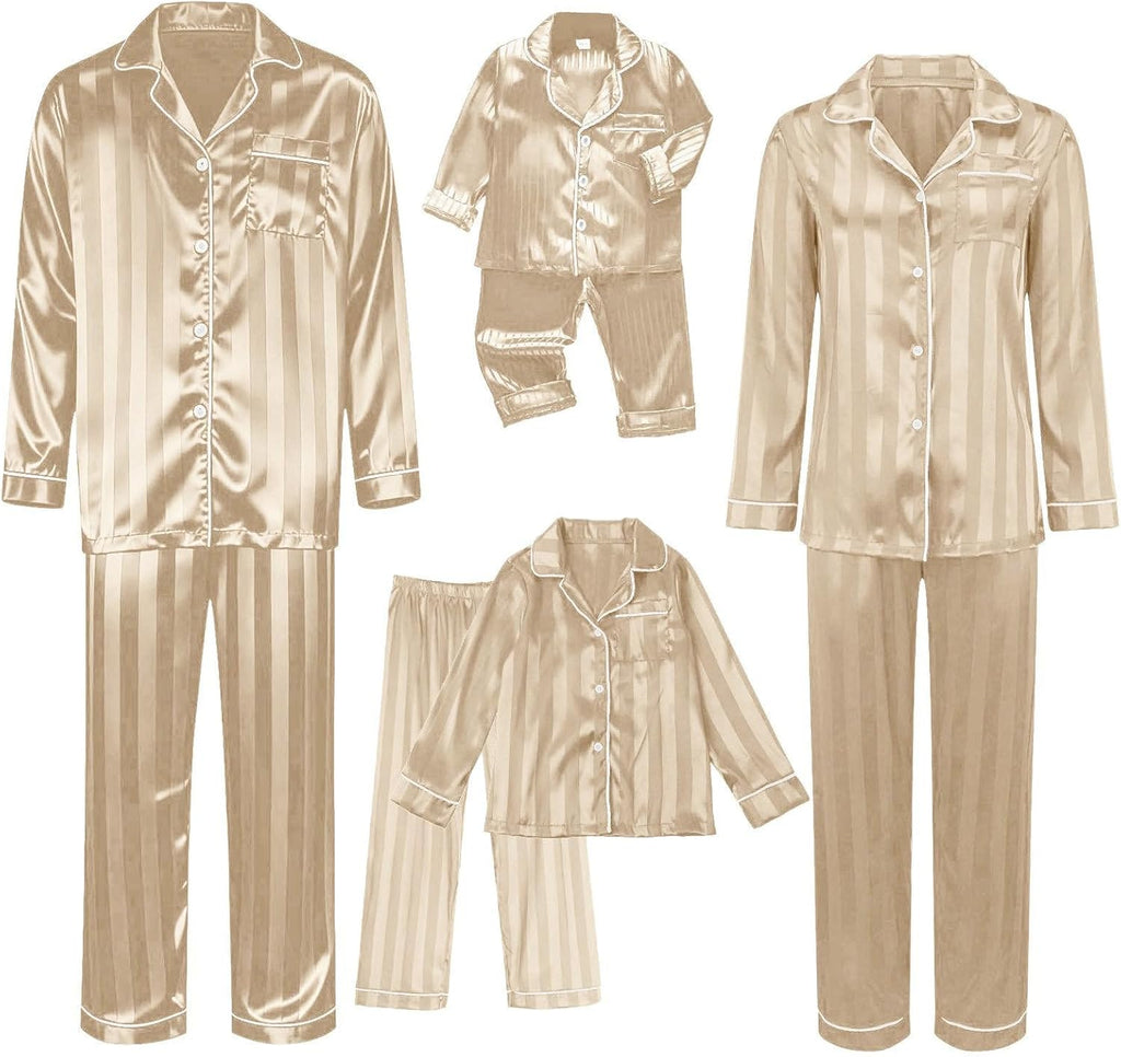 Silk Matching Christmas Pajamas for Family - Striped Button Down Shirt and Pants - Silky Satin Xmas Pjs Sets for Pictures