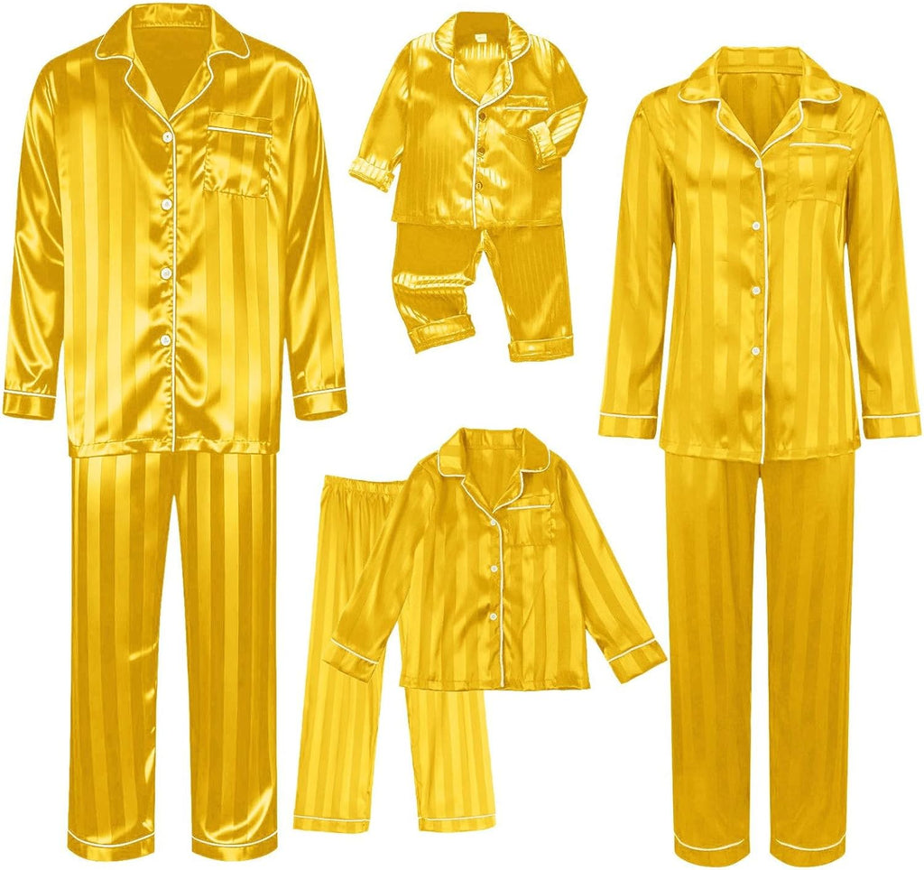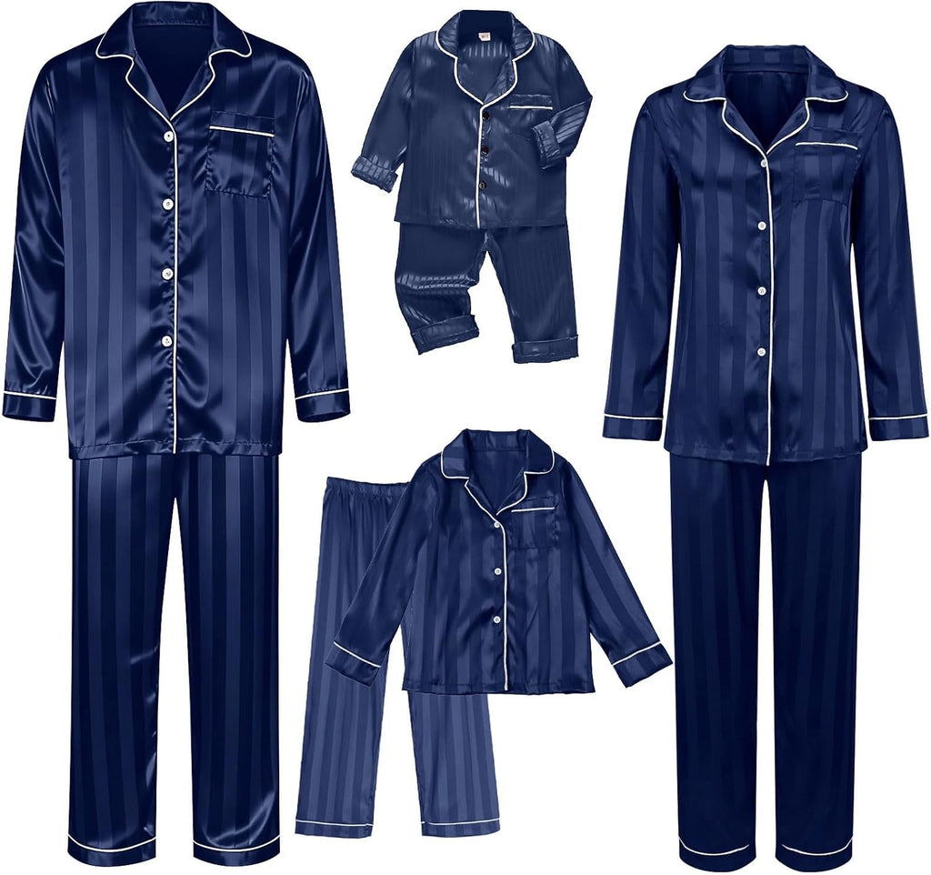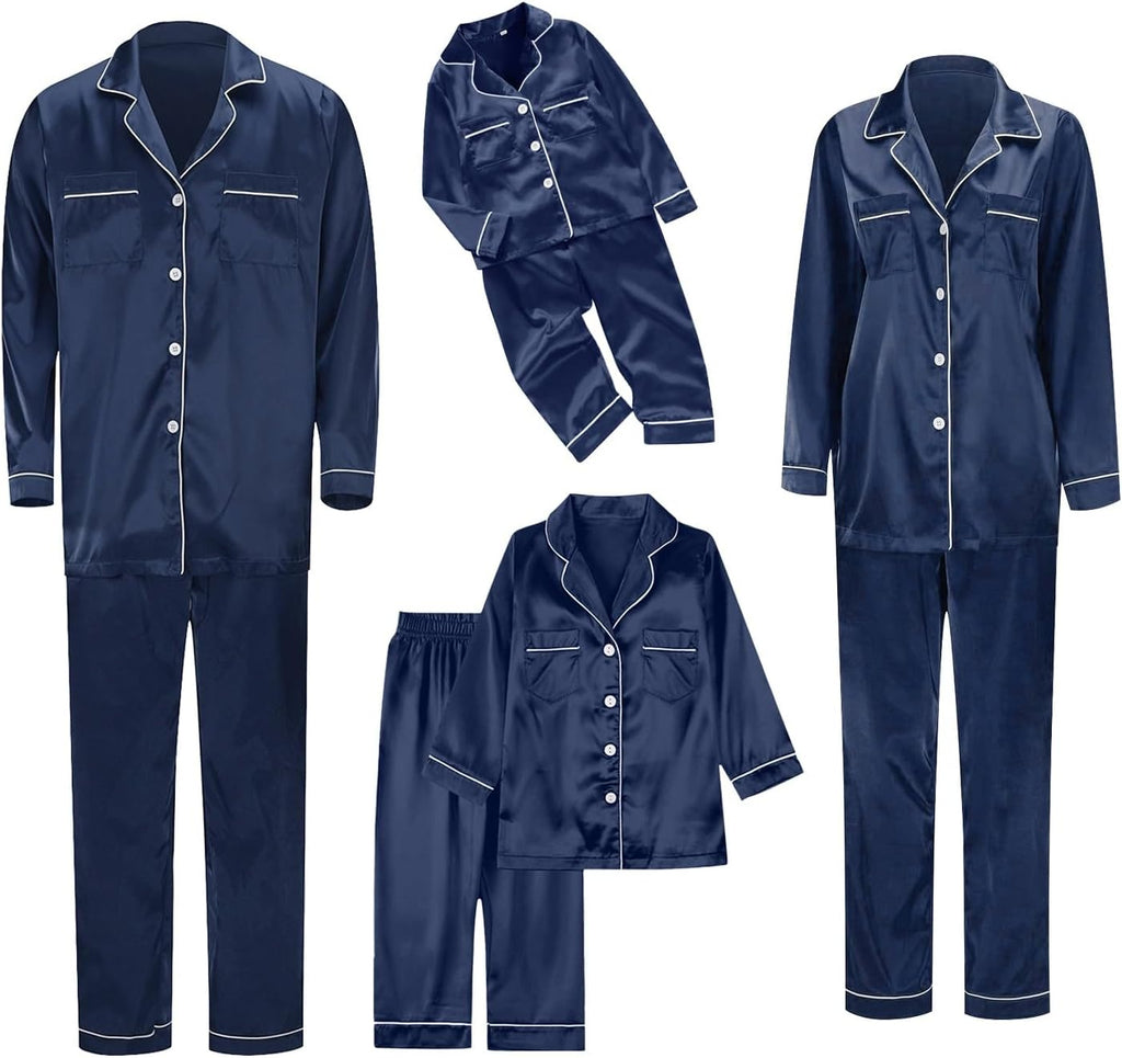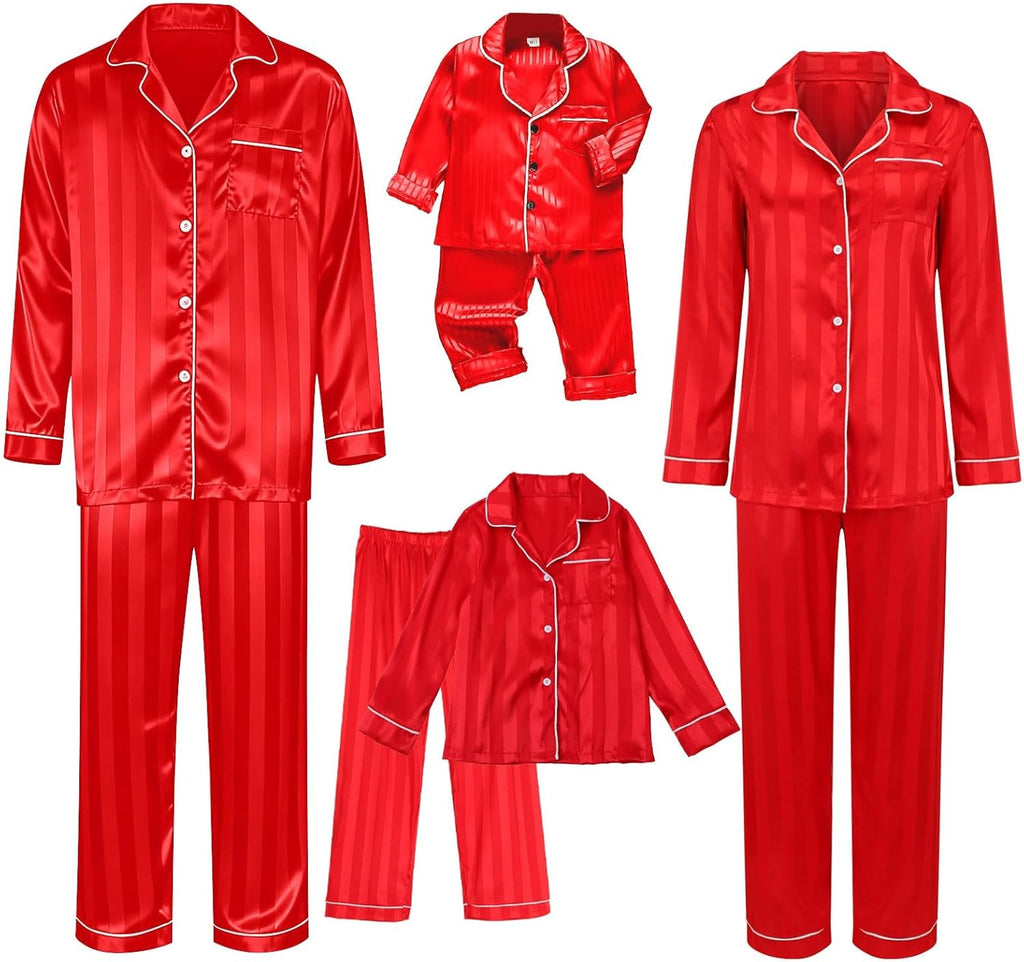 Fabric type:PLEASE NOTE: Must purchase each size individually. Origin:Made in USA or Imported. Product Facts: SOLD SEPARATELY: Family Christmas Matching Pajamas Sets are sold separately, pajama sets come in most sizes for your all family members, each size must be purchased individually for your family, please check against our size chart before ordering. Silk Christmas Pajamas for Family: This Whole Family Christmas Pajama Set features classic christmas theme design in long sleeve button down shirts and pants, make these pj's perfect for Christmas festivities. Soft and Cozy: The Satin Matching Family Christmas Pajamas are made of quality Polyester and spandex, wear soft and comfortable. Your whole family will enjoy these comfy christmas pjs; pjs set include long sleeve shirt and soft full-length pants with a stretchy elastic waistband. Occasions: Silky Family Christmas Pajamas are perfect for taking pictures of the whole family. Family together home party, christmas, holiday, weekends, family dinner night, home wear, gift for family or friends, etc. It can make your big family more close and stick together. SIZE NOTE: Satin Family Christmas Pjs Matching Set comes in sizes for various ages for a picture perfect matching look during the Christmas holiday. Must purchase each size individually. Please refer to our SIZE CHART in the last image before ordering. Recommend order 1-2 size up because of the snug fit.