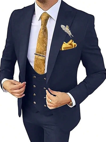 Features: Great quality. Top Type: Blazer. Details: Button. Sleeve Length: Long Sleeve. Belt: No. Bottom Type: Pants. Pattern Type: Plain. Fit Type: Regular Fit. Placket: Single Breasted. Occasion: Night Out, Weekend Casual, Holiday. Sleeve Type: Regular Sleeve. Season: All. Neckline: Peak Lapels. Ideal for: conventional. Occasion: Formal & Evening, Anniversary. Style: Business - Evening Attire, Business - Formal Business. Ideal for: Couple Male. Color: Navy Blue. Fabric Elasticity: Non-Stretch. Length: Regular. Material: Fabric. Composition: 80% Polyester, 20% Viscose. Care Instructions: Hand wash, do not dry clean. Lined For Added Warmth: No. Pockets: Yes. Sheer: No.