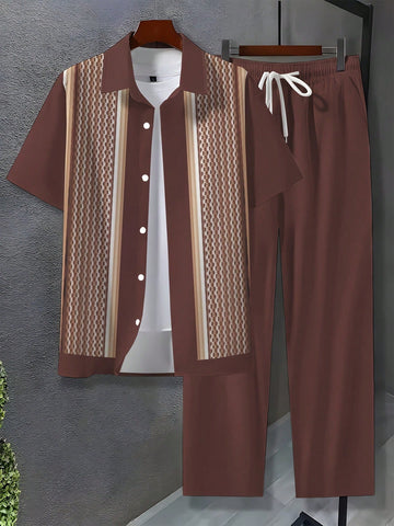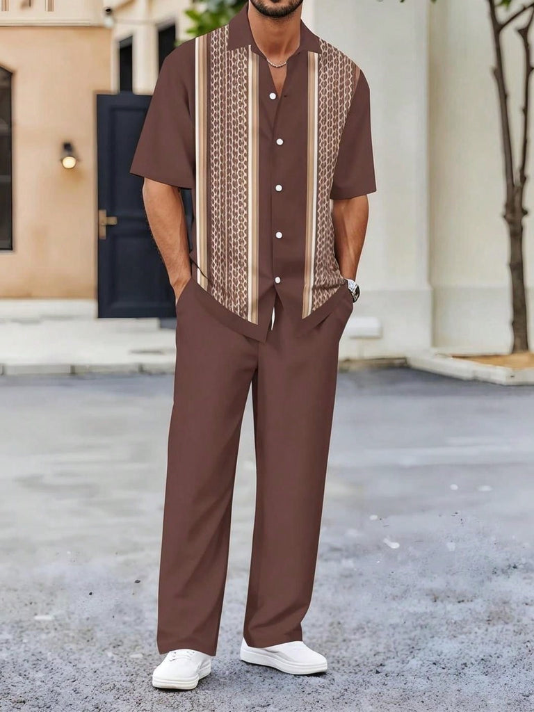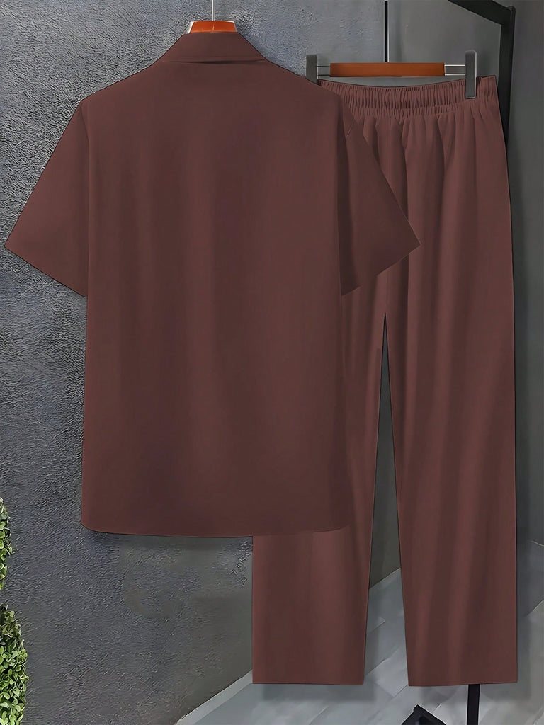 Men's Suit Short Sleeved Lapel Shirt And Pocket Drawstring Pants Set