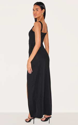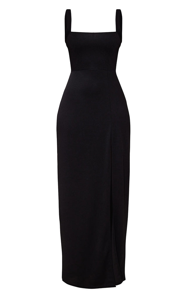 Keep it sleek in this black straight neck maxi dress. Made from black material, this dress has a square neckline, thick shoulder straps, a leg split and a maxi length fit. Wear it with understated heels and a complementing bag for the perfect evening look.