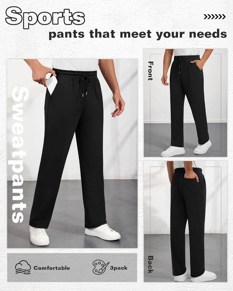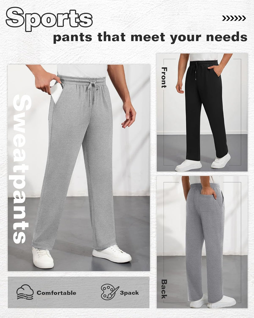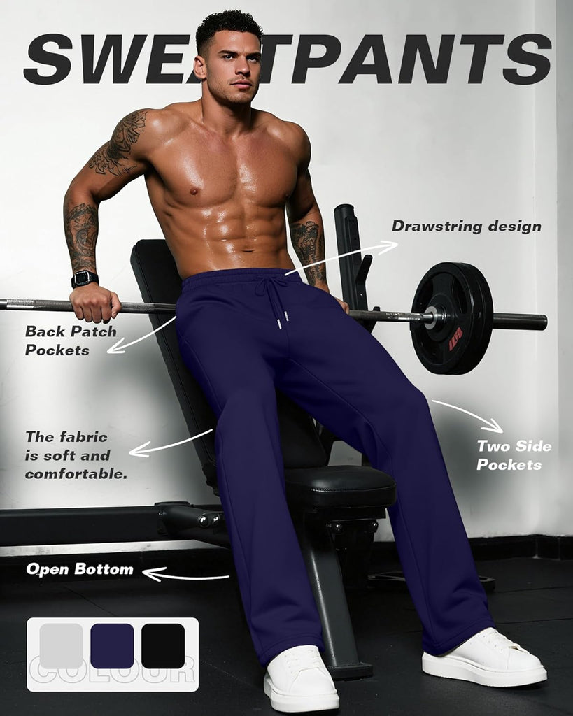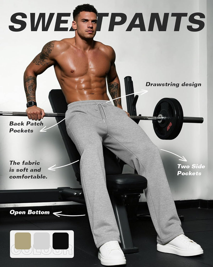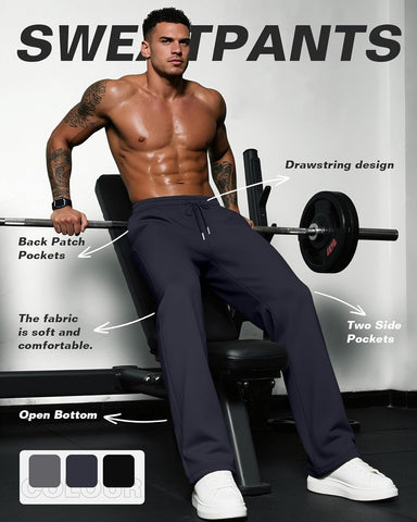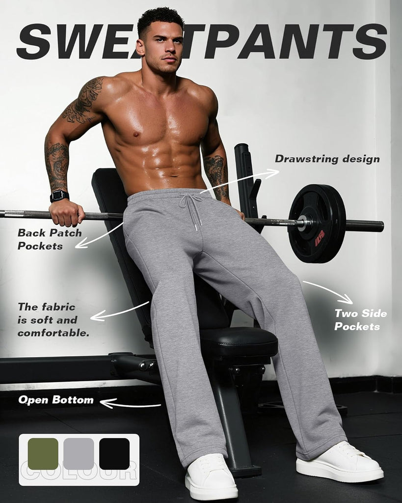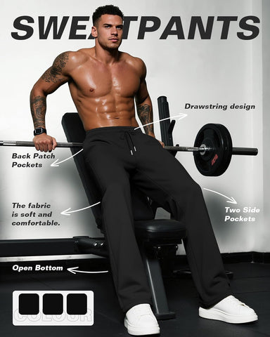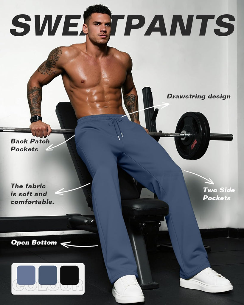 • Features: drawstring straight leg open bottom design makes it stylish and comfortable whether for daily wear or sports; Our men's open bottom sweatpant 3 pockets: these sweatpants with 2 side pockets and 1 back pocket to provide enough storage space
