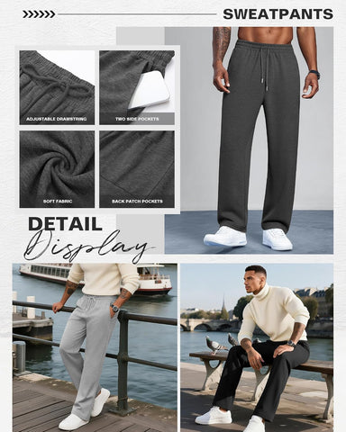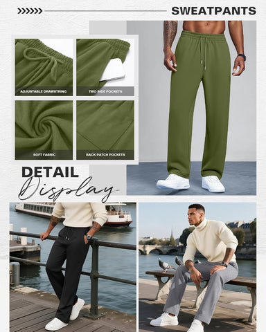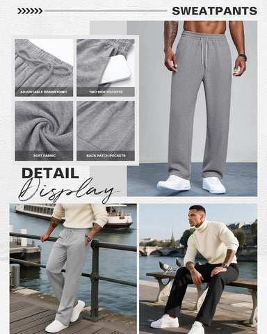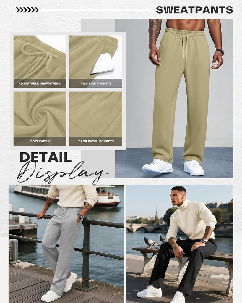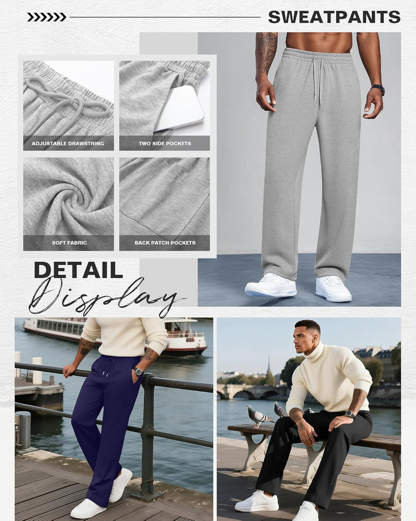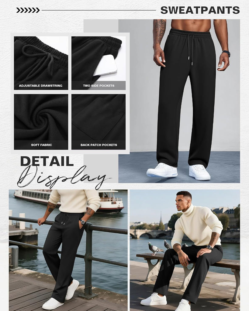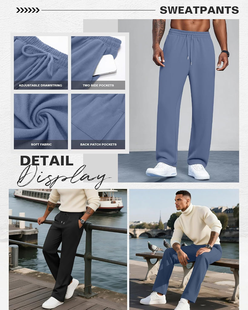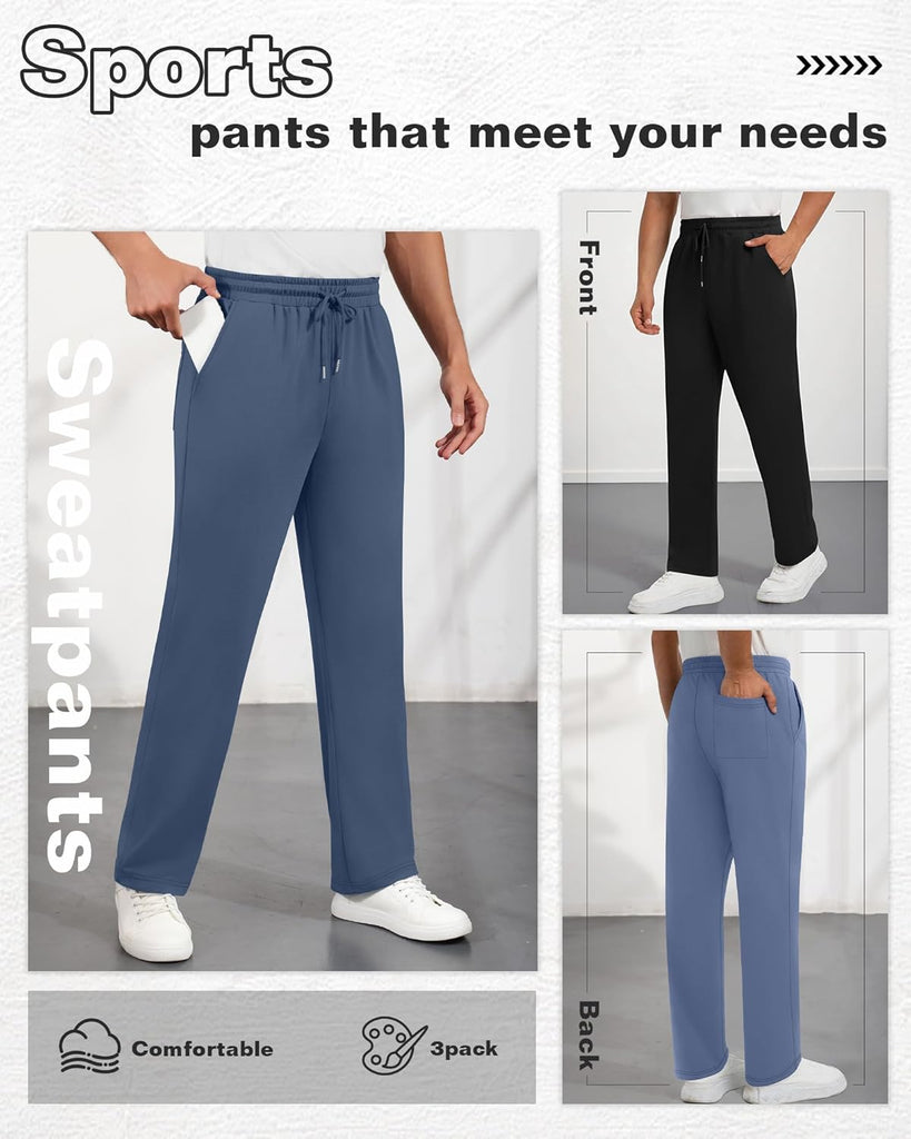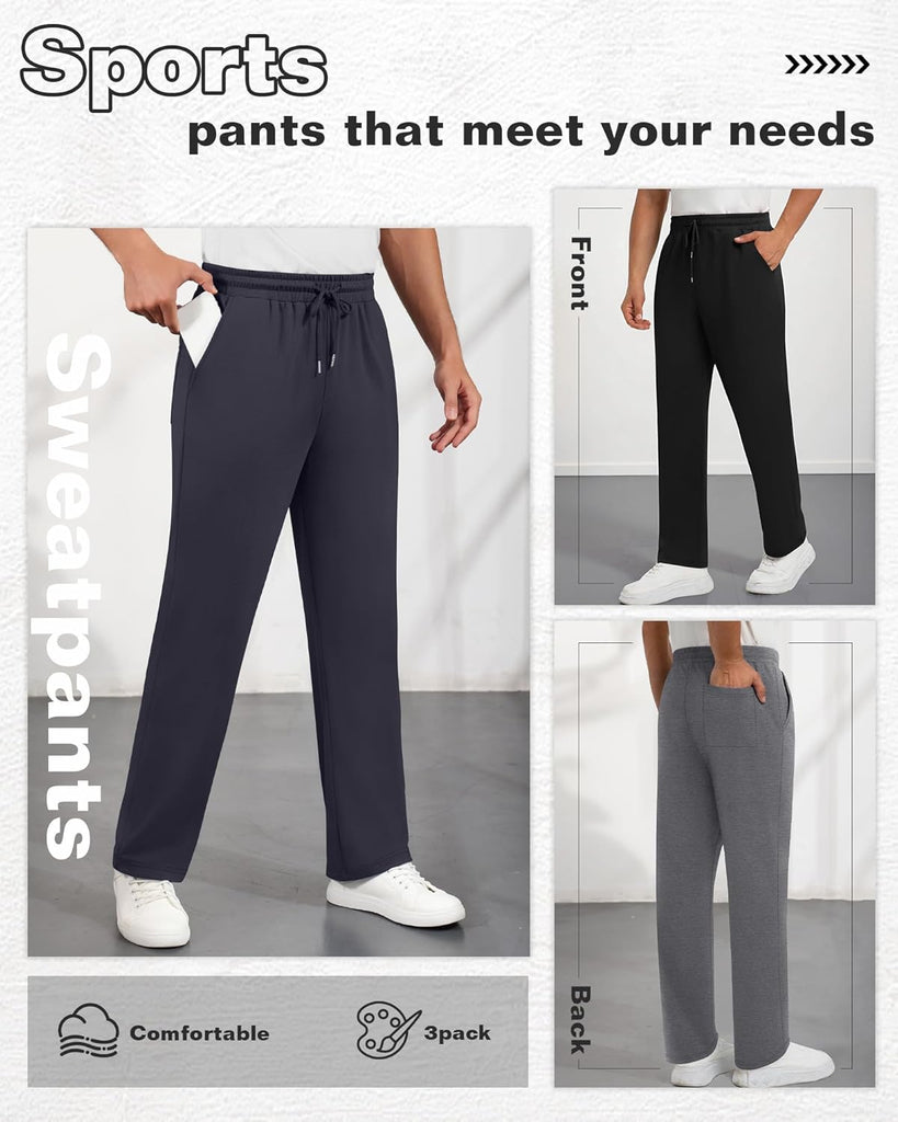 • Features: drawstring straight leg open bottom design makes it stylish and comfortable whether for daily wear or sports; Our men's open bottom sweatpant 3 pockets: these sweatpants with 2 side pockets and 1 back pocket to provide enough storage space