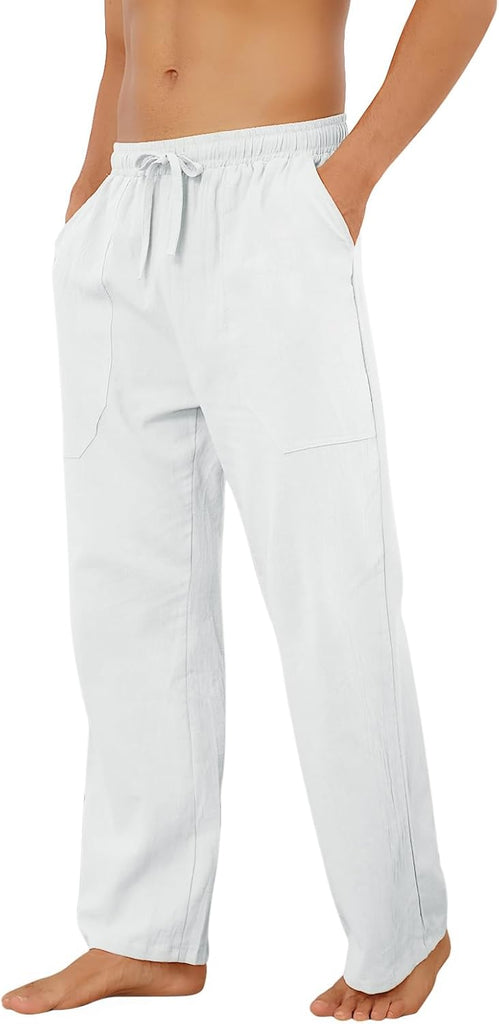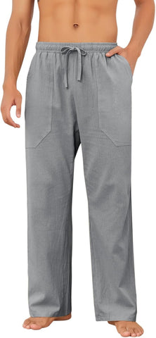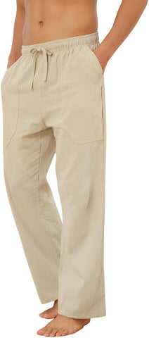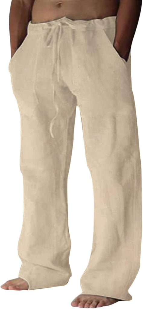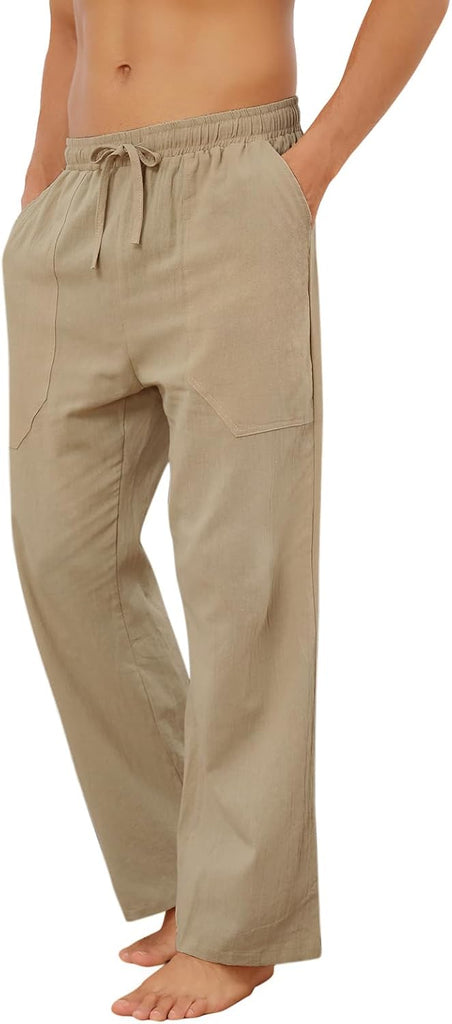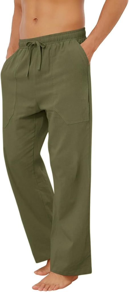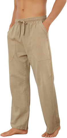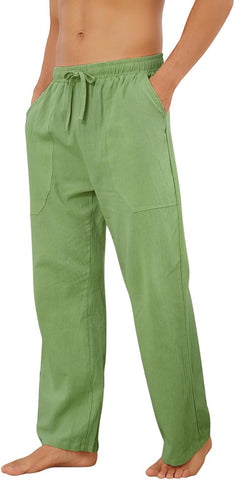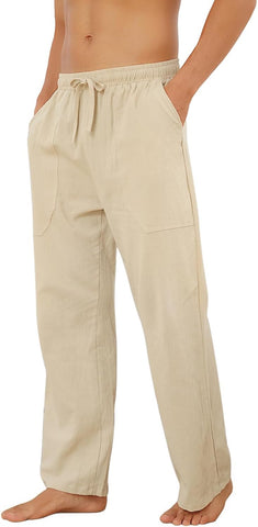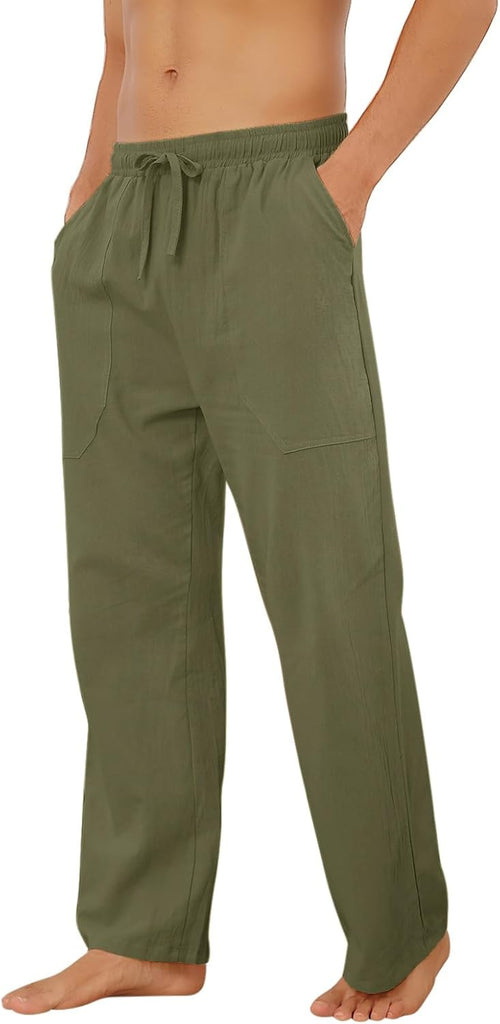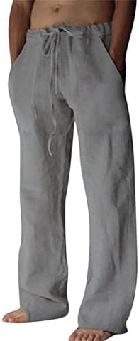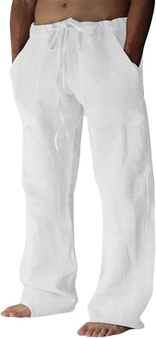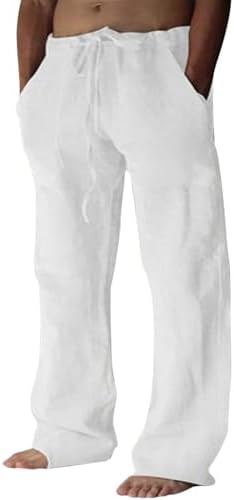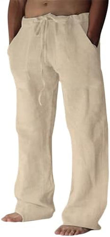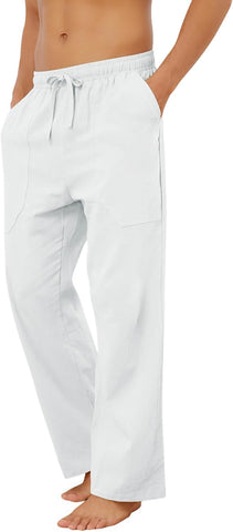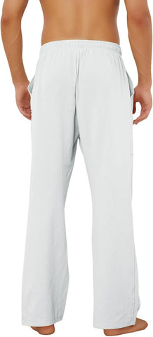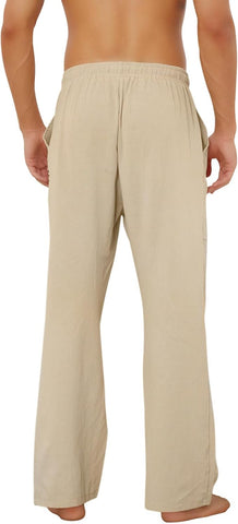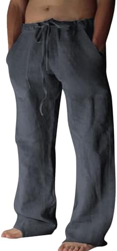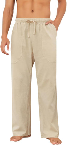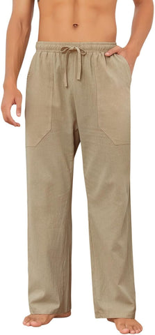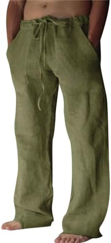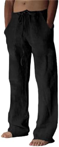 Cotton Linen Pants Men Casual Loose Fit Elastic Drawstring Waist Summer Beach Pants
