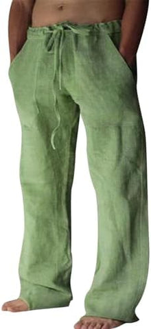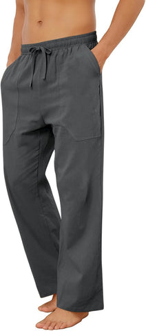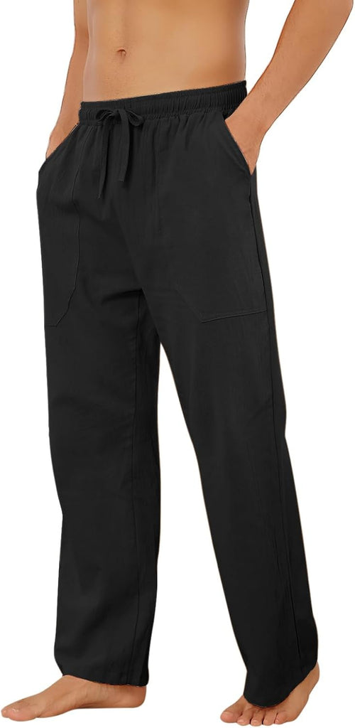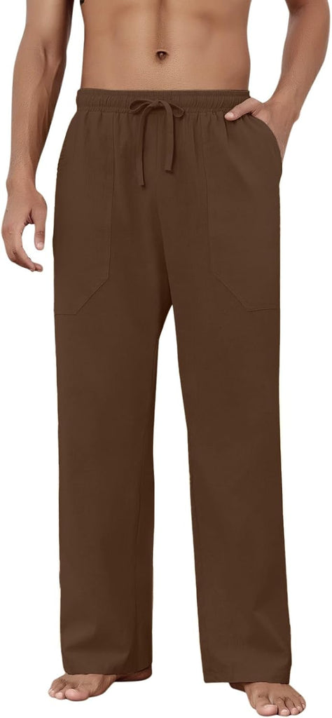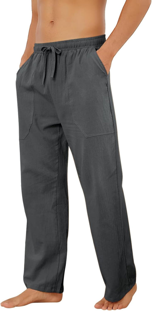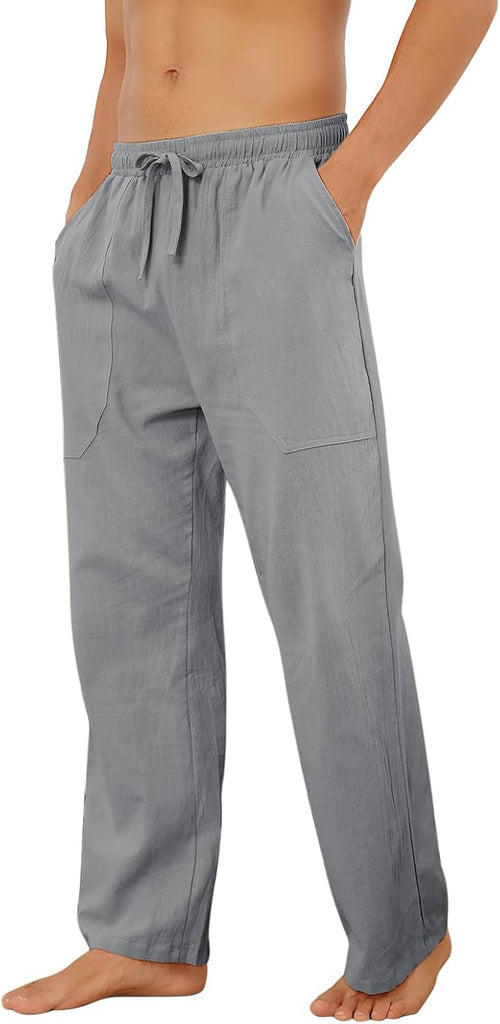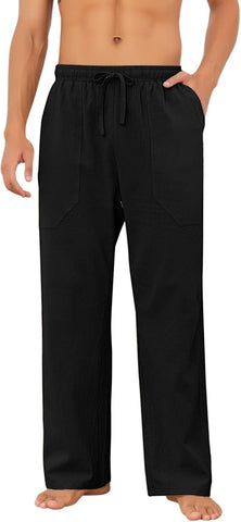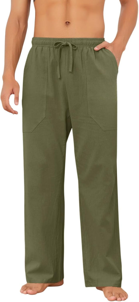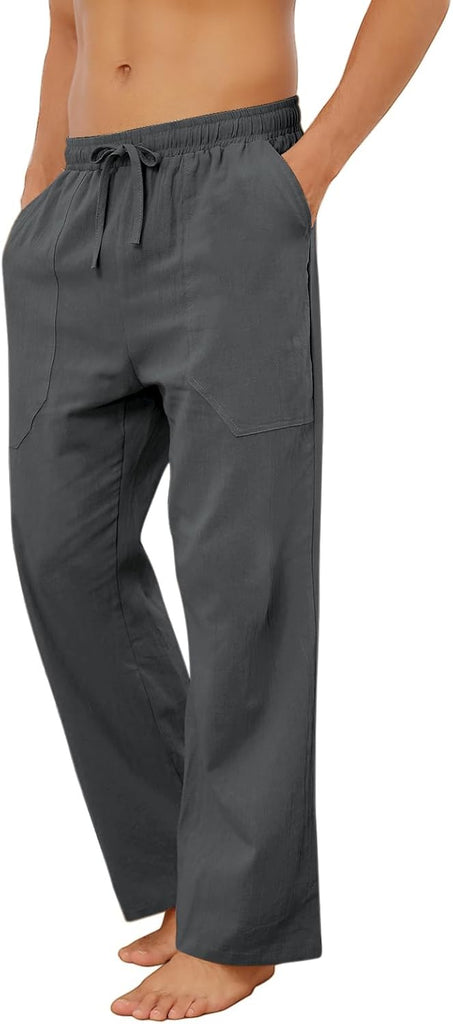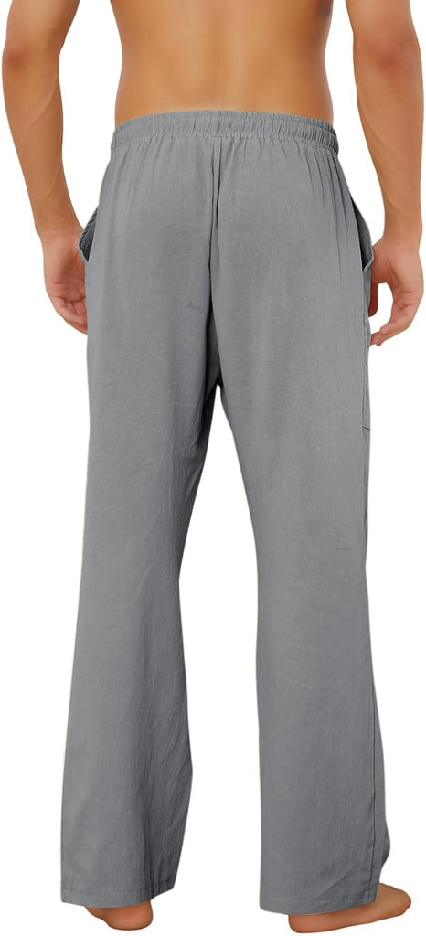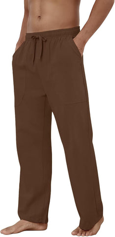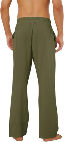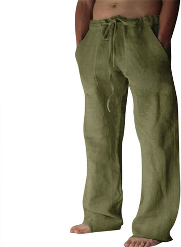 Cotton Linen Pants Men Casual Loose Fit Elastic Drawstring Waist Summer Beach Pants