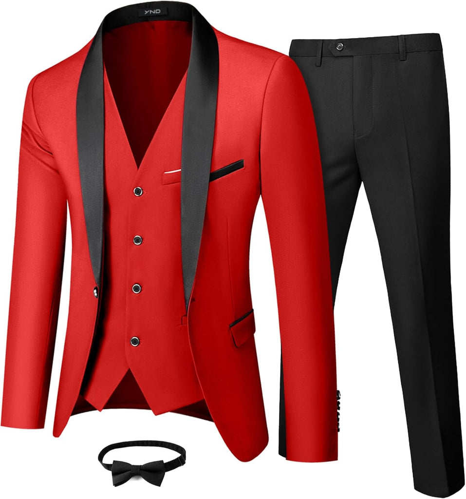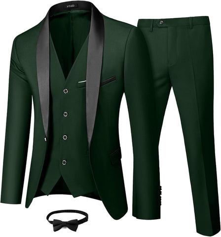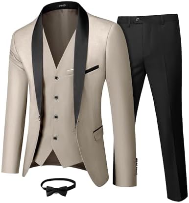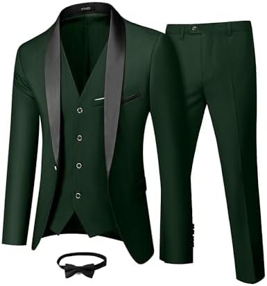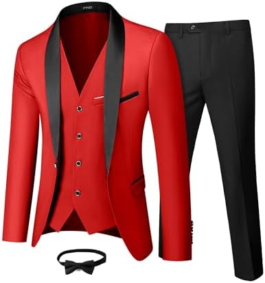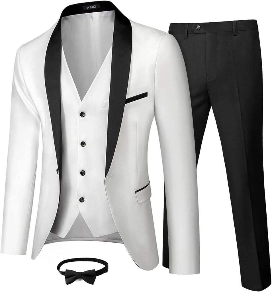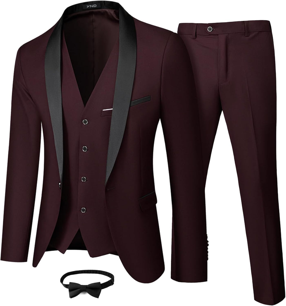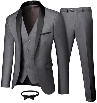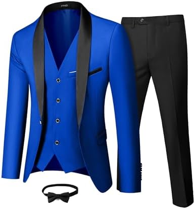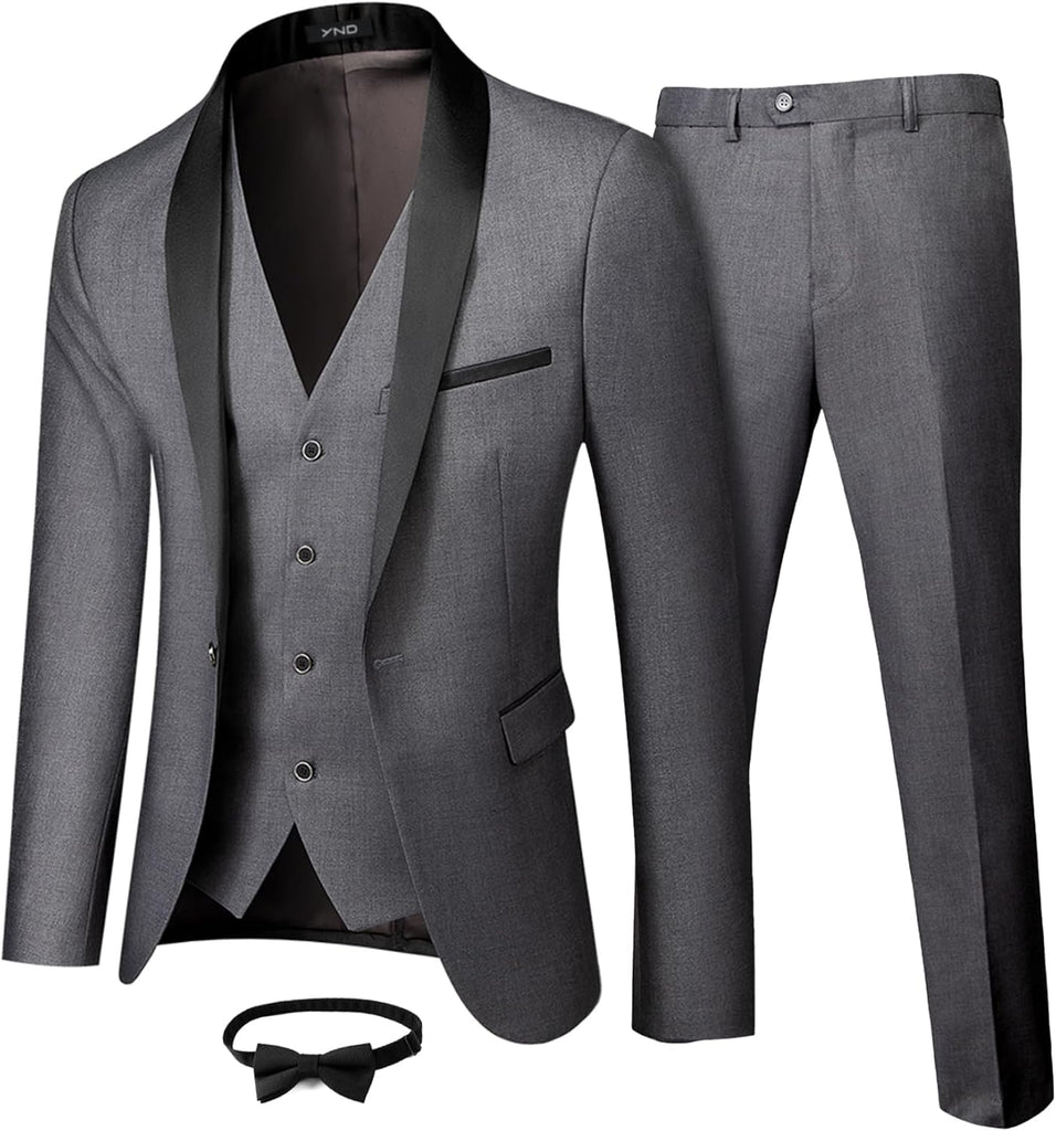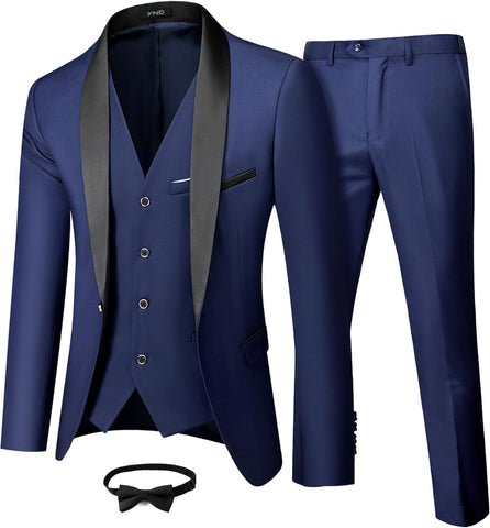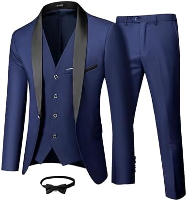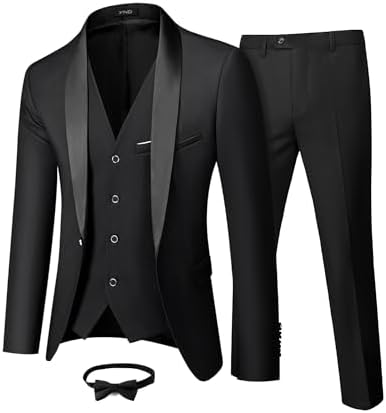 Men's 3 Piece Slim Fit Tuxedo Set, One Button Shawl Collar Solid Jacket Vest Pants with Bow TieMen's 3 Piece Slim Fit Tuxedo Set