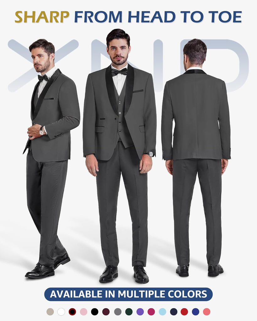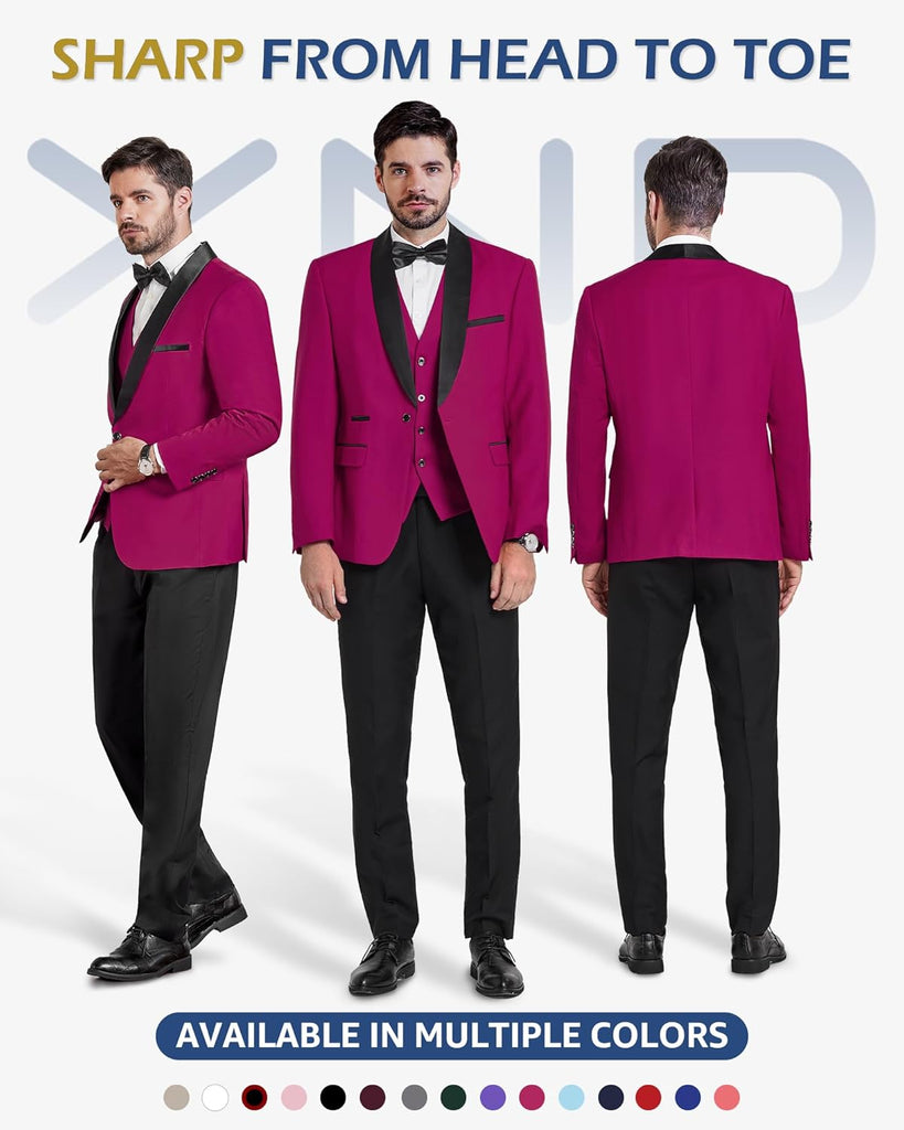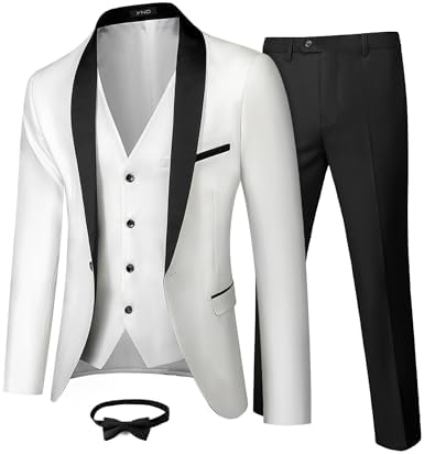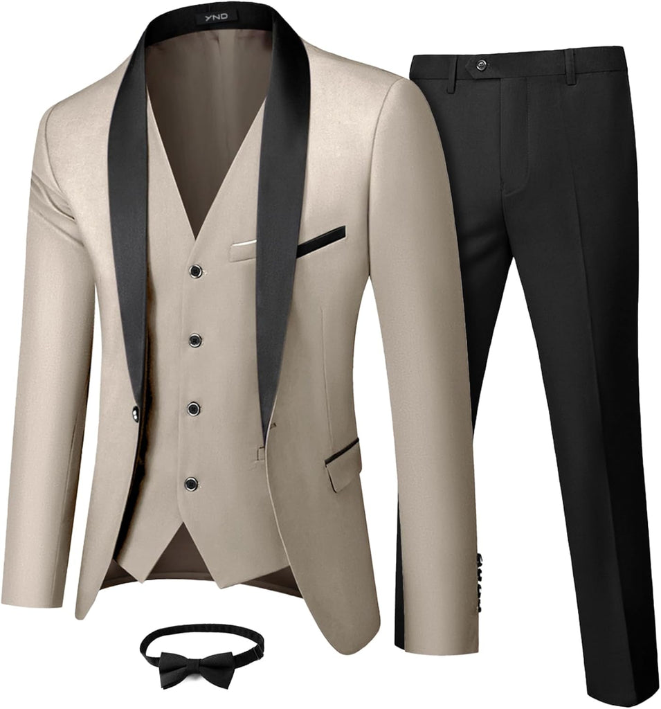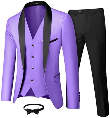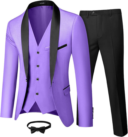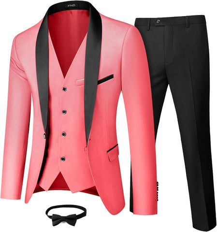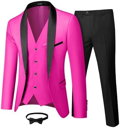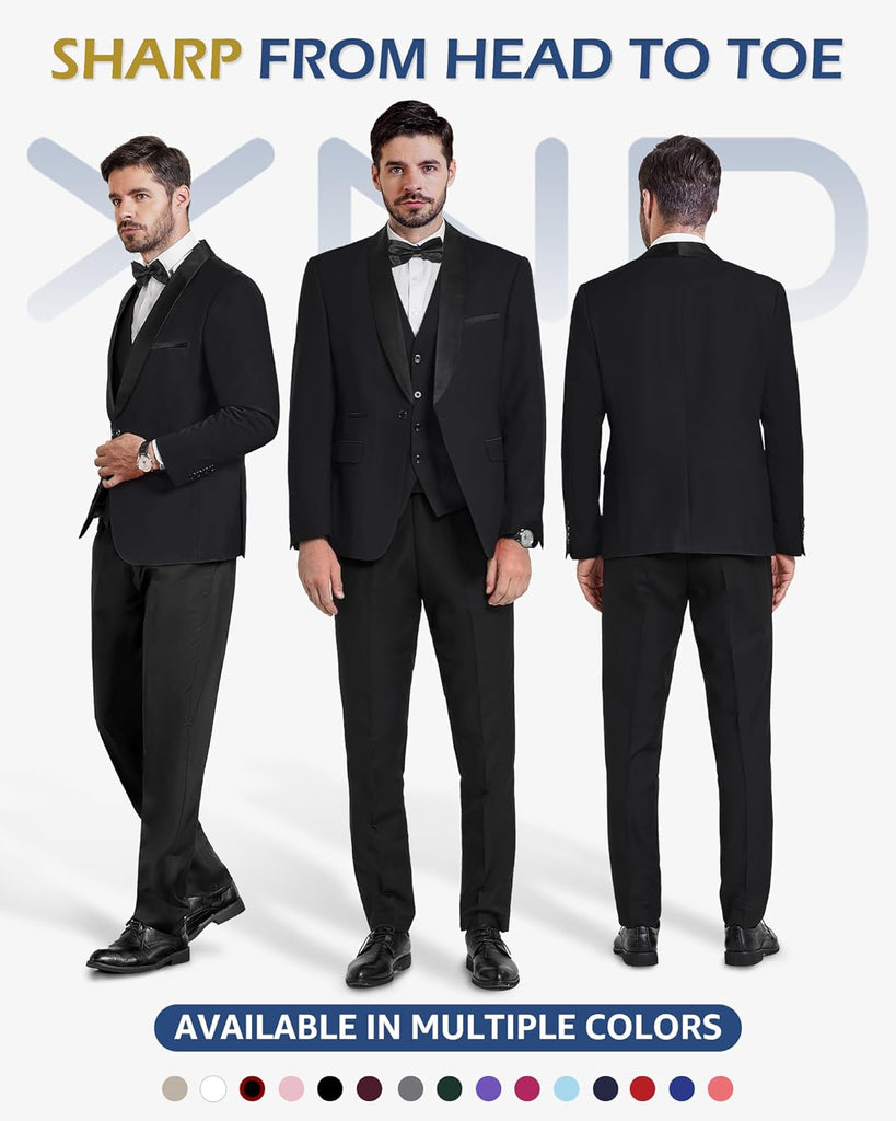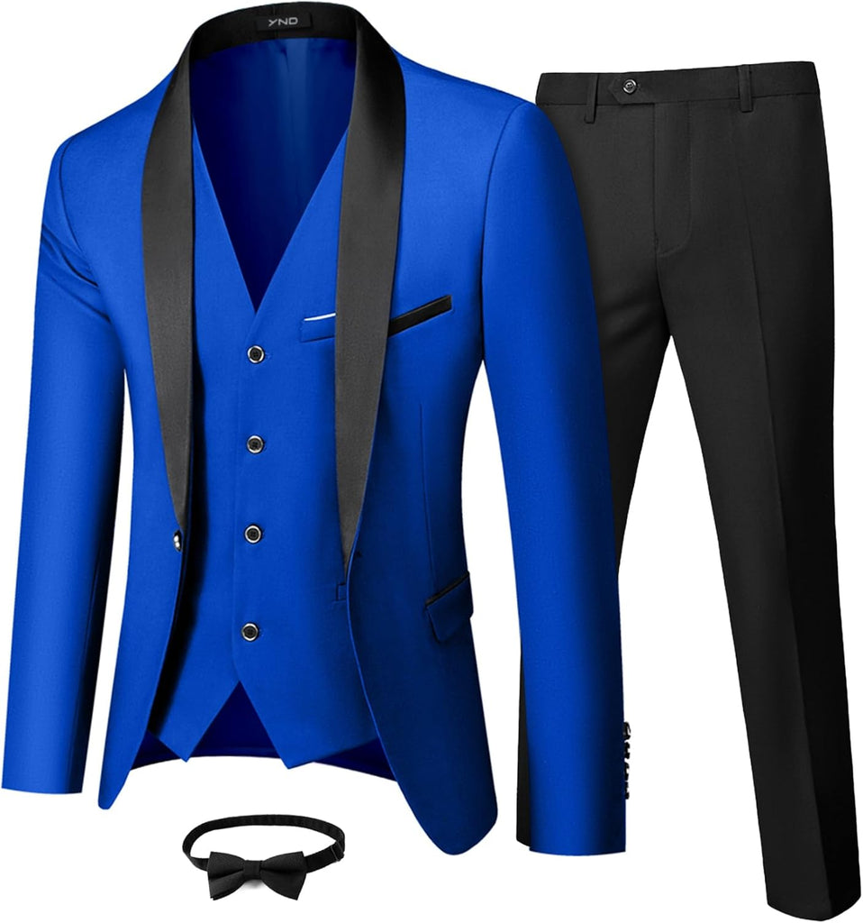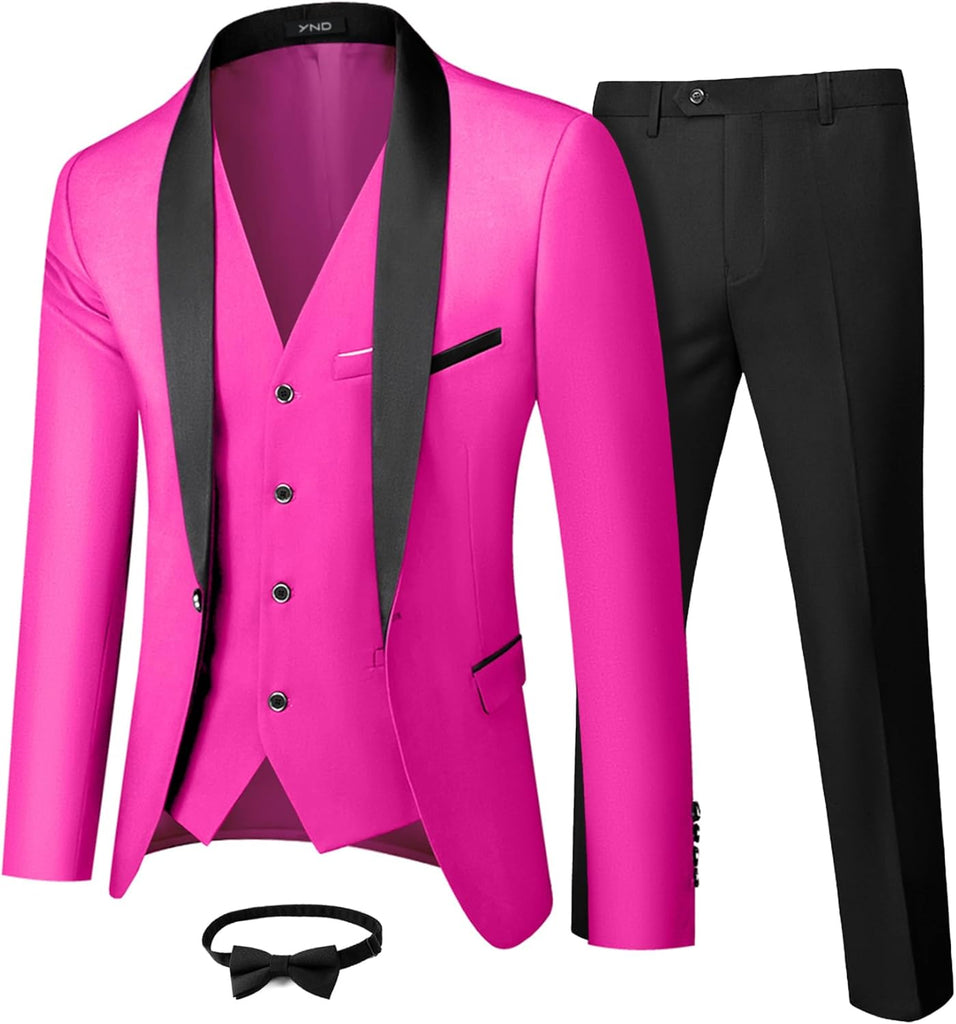 Men's 3 Piece Slim Fit Tuxedo Set, One Button Shawl Collar Solid Jacket Vest Pants with Bow TieMen's 3 Piece Slim Fit Tuxedo Set
